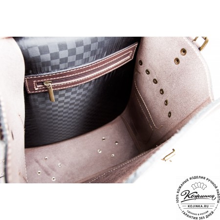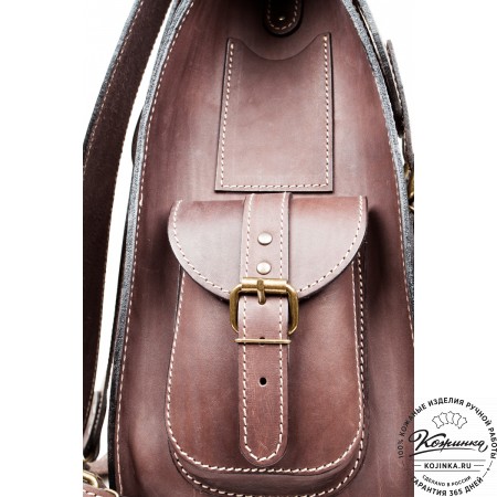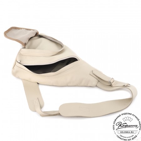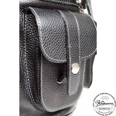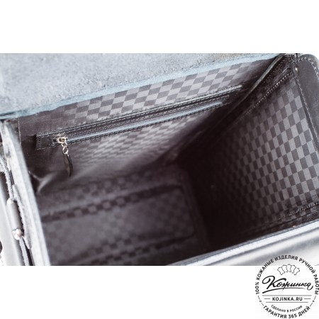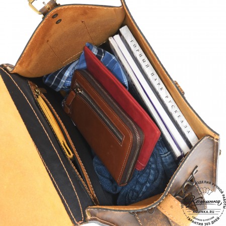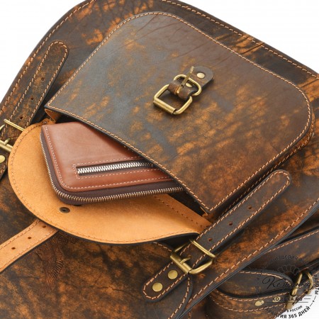 Внутри одно вместительное отделение, открывается молнией с лицевой стороны. Есть небольшой карман на задней стороне - для мелких вещей, документов. Крепкая надёжная настраиваемая конструкция на одно плечо владельца. Сверху крепкая кожаная ручка.