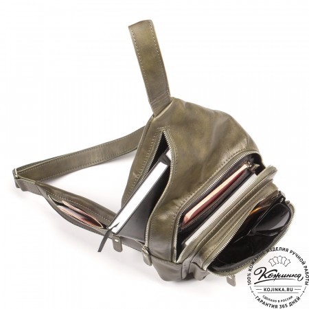 Снаружи, на передней стенке, объемный карман на магнитной кнопке. Еще один карман для телефона на магнитной кнопке, расположеный на лямке.