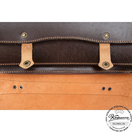 Портфель закрывается клапаном на два портфельных замка, спрятанных под ременными пряжками.