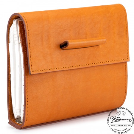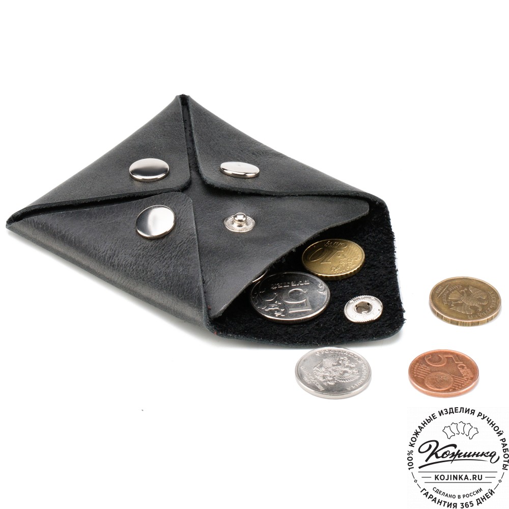 Монетница изготовлена из прочной натуральной кожи. Закрывается на кнопку.